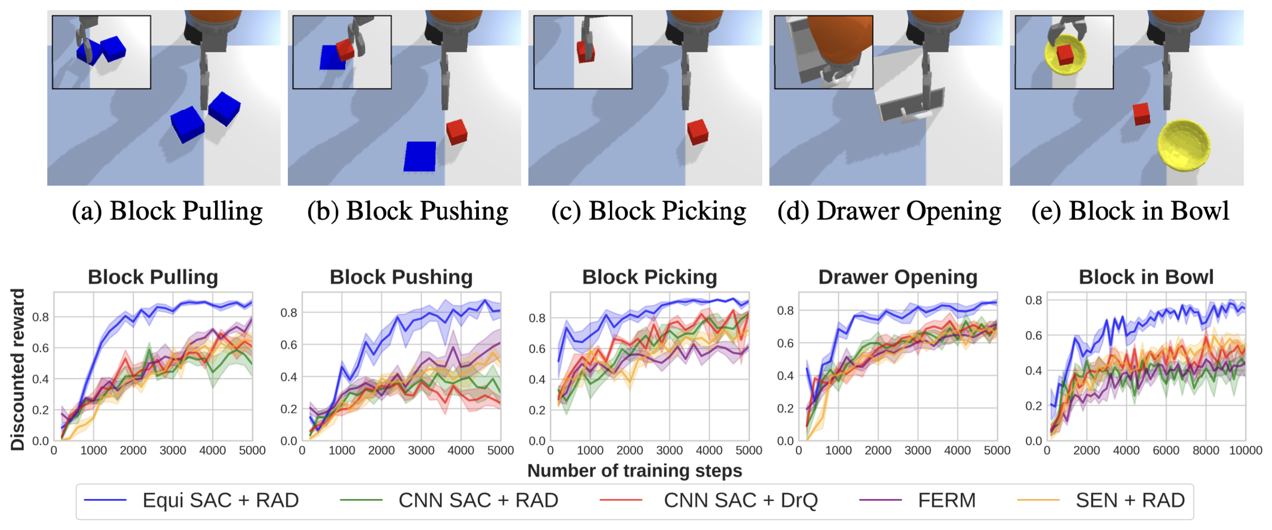 We test our proposal in robotic manipulation (and in other domains, please see the paper), where the observation is taken from a camera with a tilted view angle. We show that the extrinsic equivariant methods (blue) significantly outperforms the unconstrained baselines.